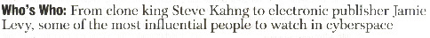 Though only 28, she’s a charter member of the East Coast interactive art and publishing scene. She’s created a virtual ‘zine called Electronic Hollywood, and an interactive disc for Billy Idol’s CD-ROM. Now, as the Internet goes multimedia, Levy is designing a new Net magazine called WORD.com. |